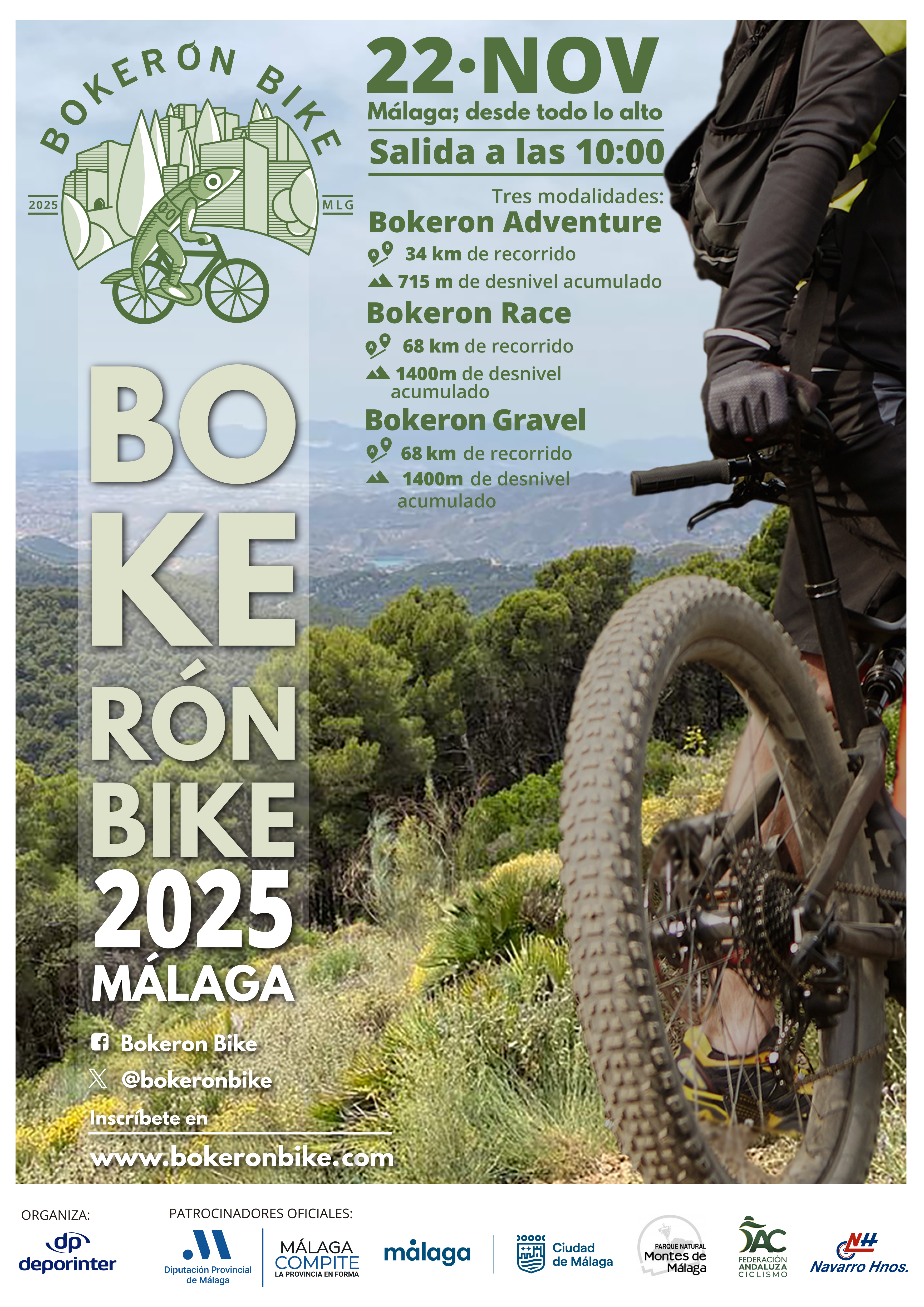 La Bokerón Bike es una prueba de MTB y GRAVEL que se celebrará el 22 de noviembre de 2025 en el Parque Natural de los Montes de Málaga. Su salida se realizará a las 10h en la Explanada de las Contadoras con llegada en el mismo lugar de salida. Tiene 3 modalidades de inscripción, la Bokerón Adventure, Bokerón Race y Bokerón Gravel, en un circuito de 34 km.