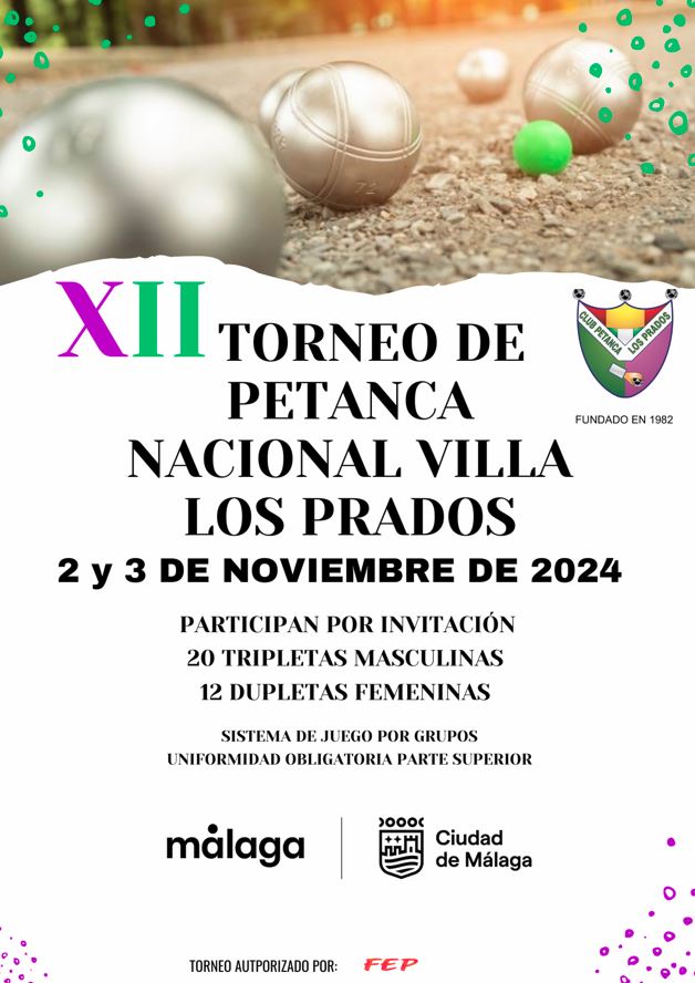 Más de 30 conjuntos de Andalucía competirán el próximo fin de semana, 2 y 3 de noviembre, en el XII Torneo Nacional de Petanca de Los Prados. La cita deportiva reunirá a 20 tripletas masculinas y 12 femeninas. La competición se llevará a cabo en las instalaciones de petanca del club Los Prados en el distrito Cruz de Humilladero. Este torneo es uno de los que está federado en el conjunto de la competición nacional.