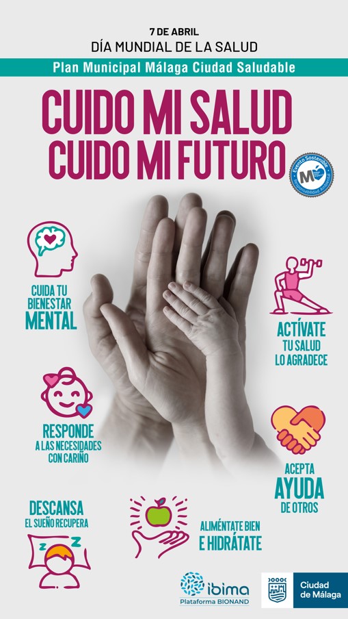 El Ayuntamiento de Málaga a través del Departamento de Políticas Inclusivas del Área de Derechos Sociales y del Área de Deporte, va a celebrar el Día Mundial de la Salud. El desarrollo de la jornada cuenta con la colaboración de IBIMA y Málaga Cómo Te Quiero. Con este evento, se pretende sensibilizar a la población malagueña sobre la importancia llevar un estilo de vida saludable basado en: una alimentación sana y equilibrada, la práctica regular de ejercicio físico, la promoción de ocio alternativo y la importancia de la salud preventiva Este año, el lema de la Organización Mundial de la Salud, “Cuido mi salud, cuido mi futuro” y se dará prioridad a la salud y bienestar de las madres y de los recién nacidos, como concepto longitudinal desde que nacemos hasta el fin de vida, atendiendo a la esfera familiar y cómo varía nuestra salud en las diferentes etapas de lavida.