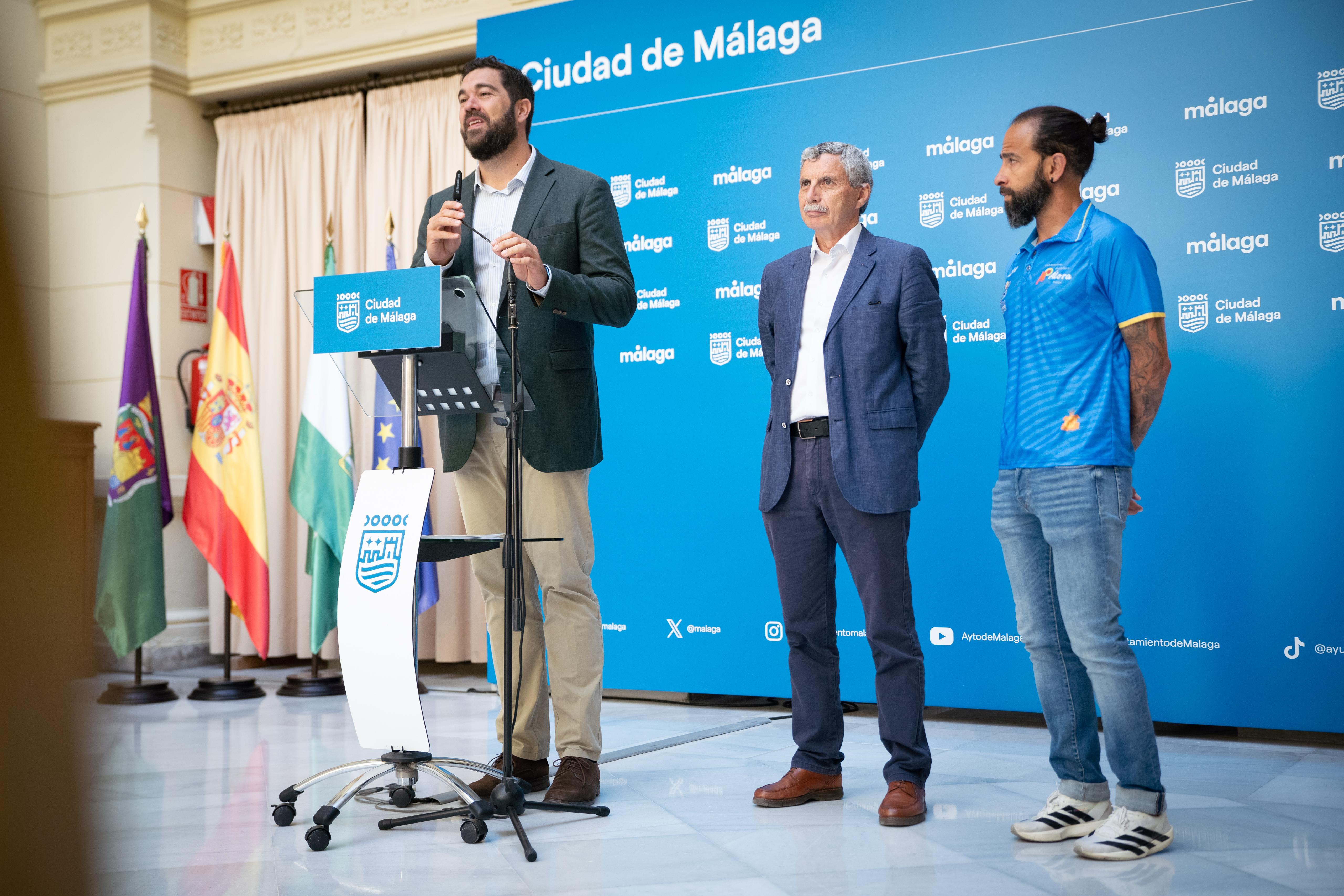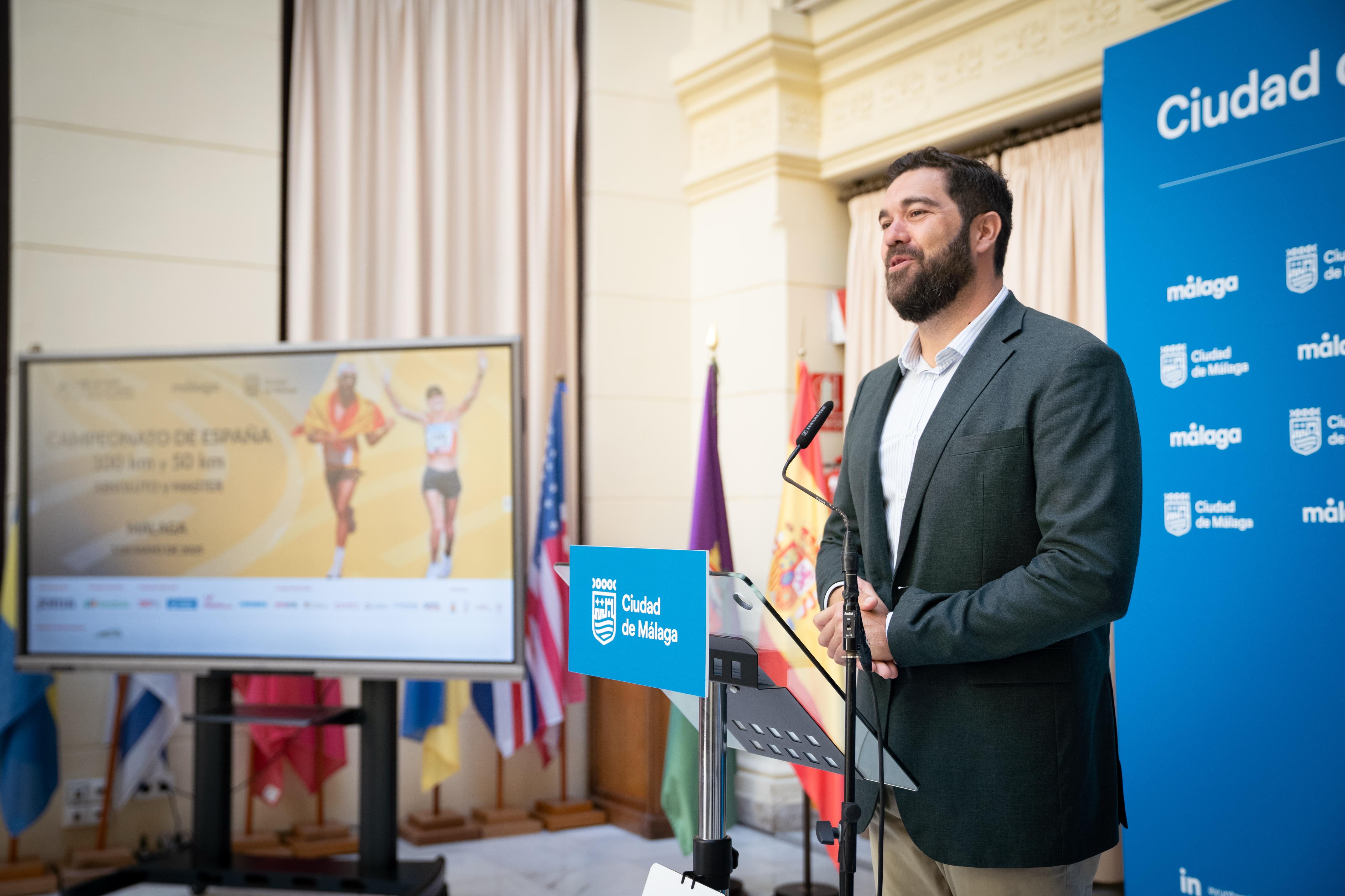El concejal delegado de Deporte, Borja Vivas, junto al presidente de la Federación Andaluza de Atletismo y vicepresidente de la Real Federación Española de Atletismo, Enrique López, y el campeón de España en la categoría de 100 kilómetros, Antonio Jesús Aguilar, ha presentado la prueba.