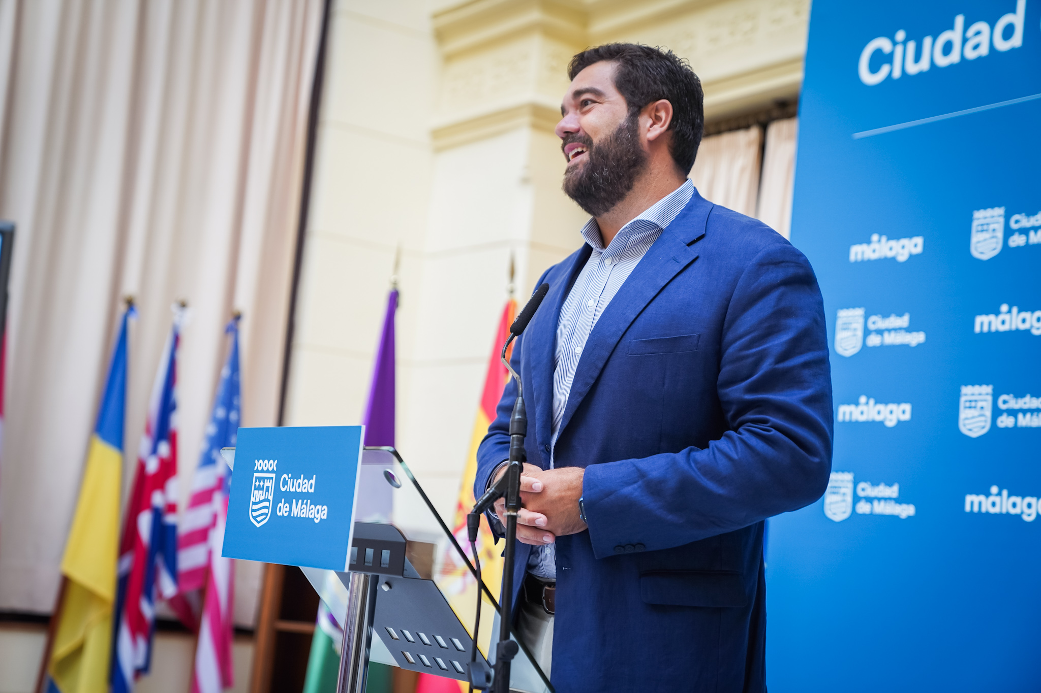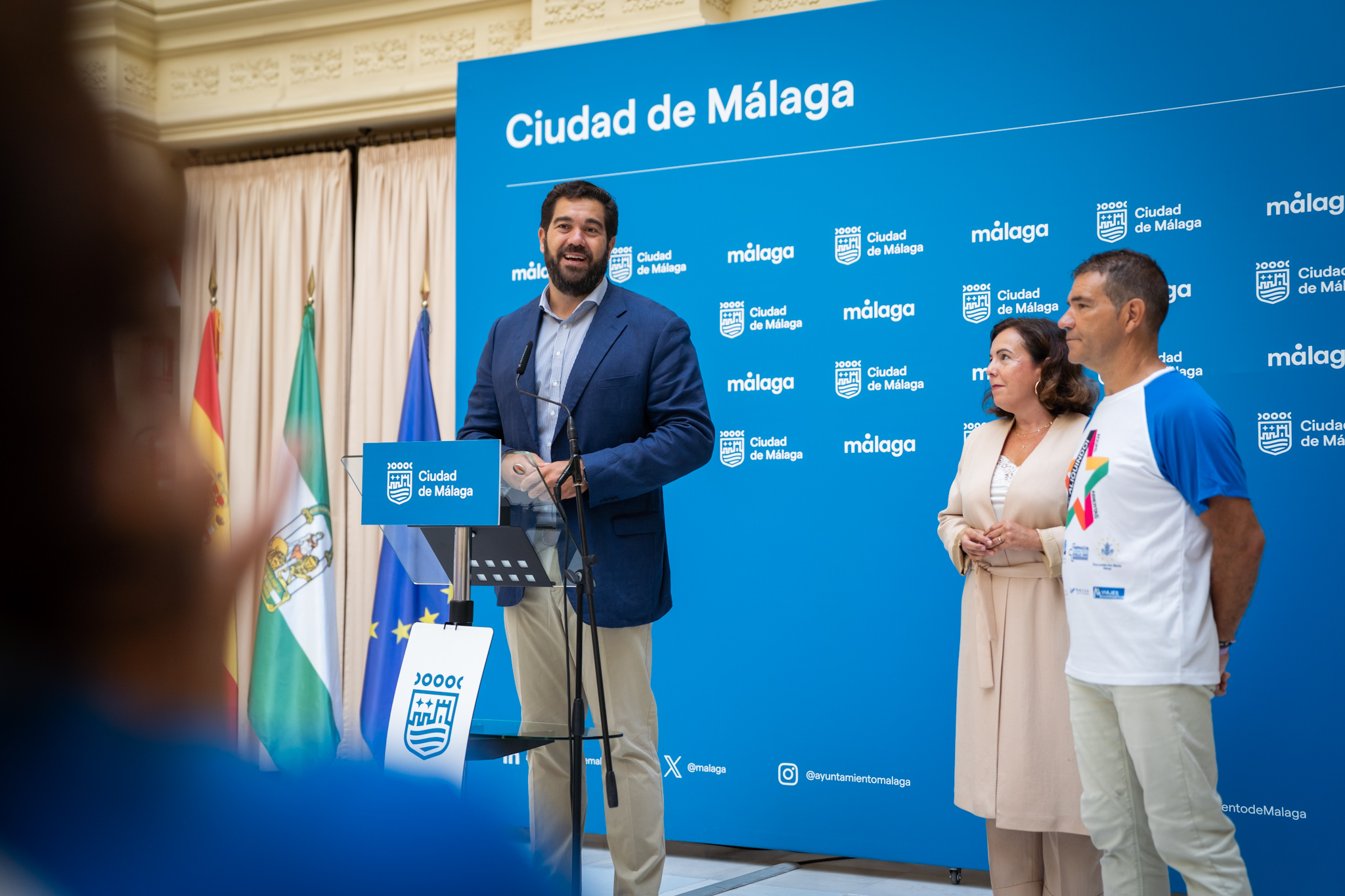 El concejal delegado de Deporte, Borja Vivas, junto al presidente del Club Aliquindoi, Francisco Pareja; y la responsable de Acción Social de CaixaBank Andalucía, Yolanda Solero, ha presentado la prueba, que cuenta con la colaboración del Ayuntamiento de Málaga. La travesía contará con dos distancias: 1.500 y 3.000 metros, y la competición por relevos.