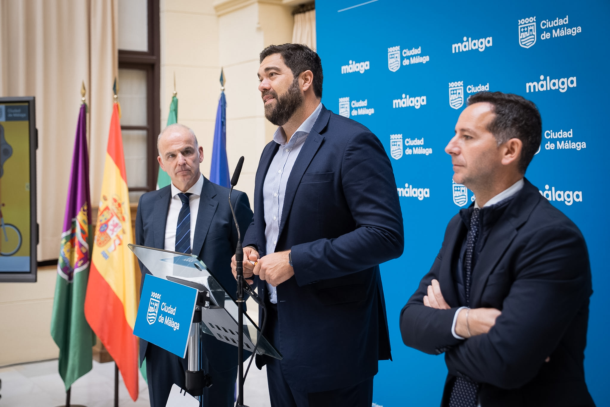 El concejal delegado de Deporte, Borja Vivas, junto al responsable de Deportes, Tiempo Libre, Medio Ambiente y Voluntariado de la Fundación Unicaja, Manuel Dorado; y el delegado regional de Comunicación y Relaciones Institucionales de El Corte Inglés, Eduardo Barrero, ha explicado los detalles de esta prueba deportiva.